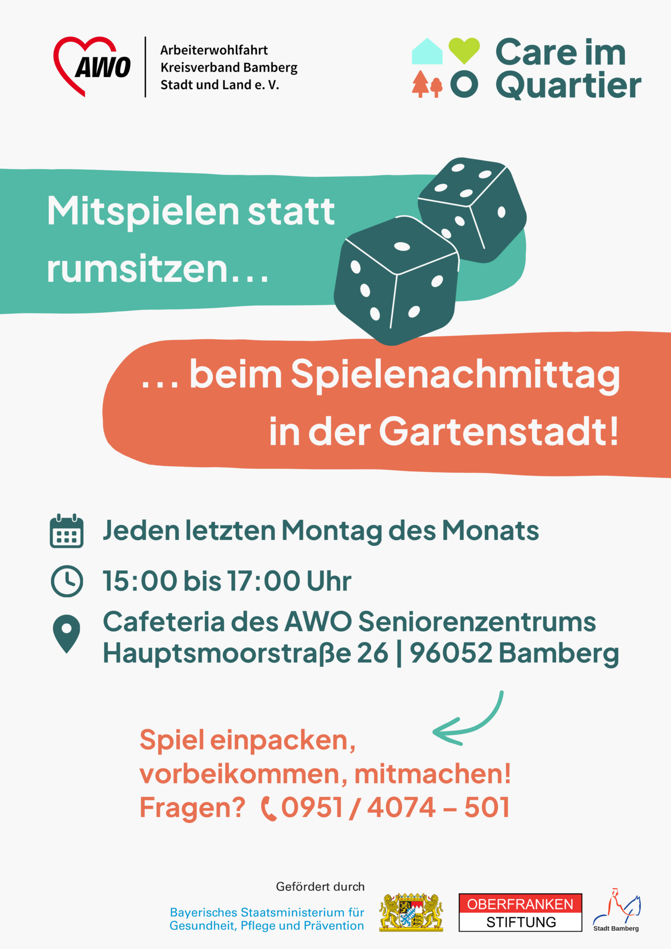 beim Spielenachmittag in der Gartenstadt. Das Stadtteilbüro Gartenstadt von Care im Quartier lädt ein zum gemeinsamen Spielen in die Cafeteria des Pflegezentrums Bamberg-Gartenstadt.